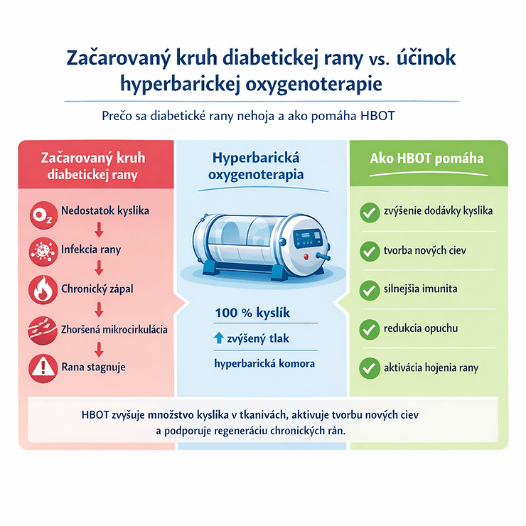 Vysvetlenie spočíva v tom, že diabetická rana sa často dostane do „začarovaného kruhu“, kde sa jednotlivé patologické procesy navzájom zhoršujú. Moderná medicína však dnes disponuje terapiou, ktorá výrazne pomáha tento proces narušiť – hyperbarickou oxygenoterapiou (HBOT).