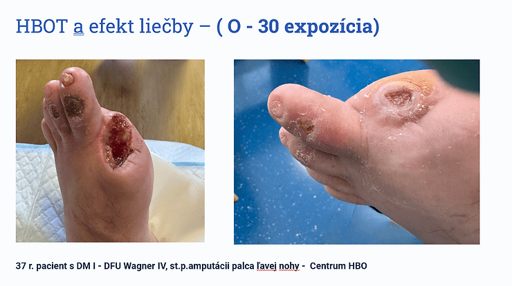 HBOT pri diabetických ulceráciach/ nehojacich sa ranách napr. po amputáciách – predstavuje integrálnu súčasť liečby spolu s ďalšími terapeutickými postupmi, ako sú revaskularizácia, chirurgická liečba rany, kontrola infekcie a optimalizácia diabetu.